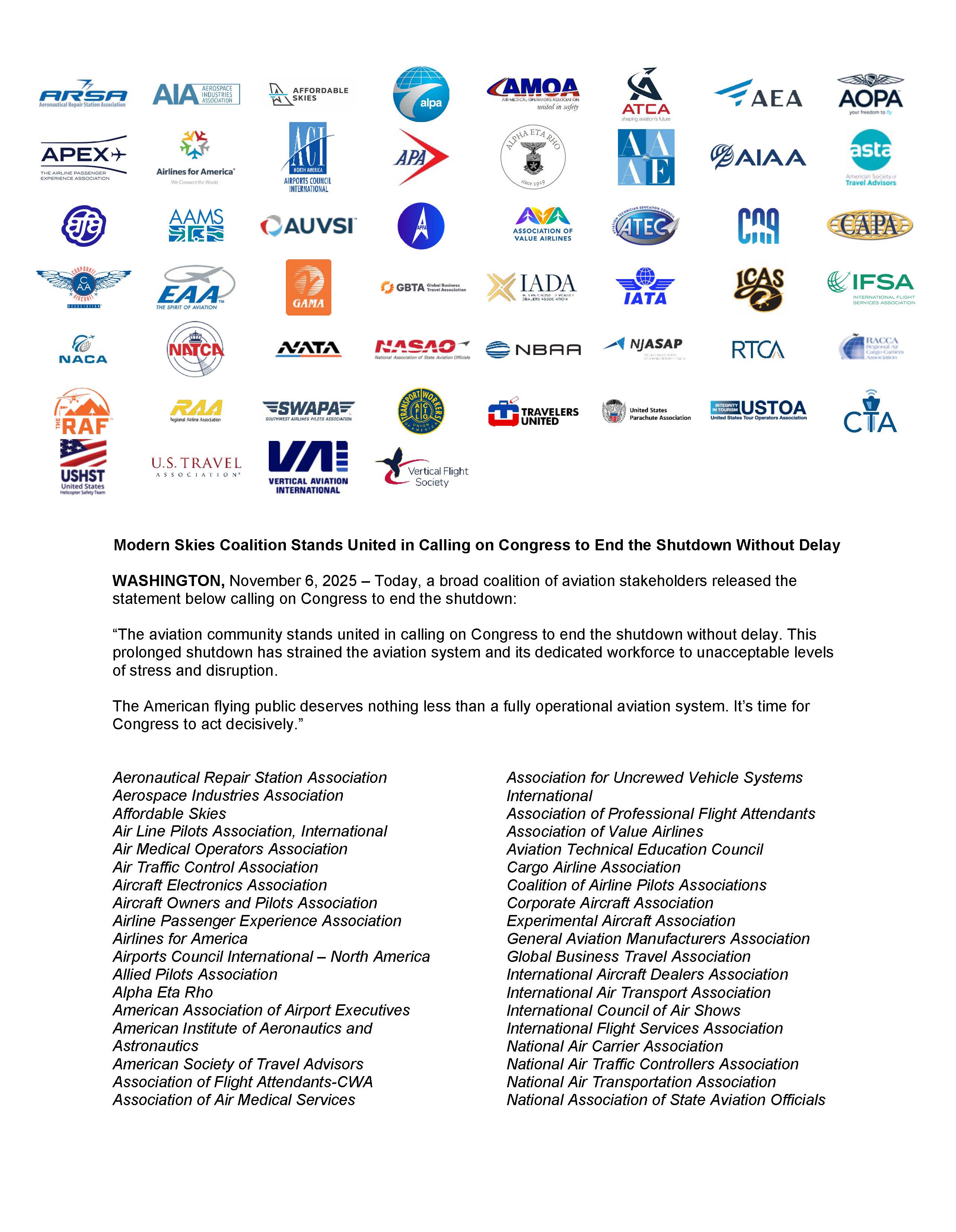 We joined the entire industry today in calling for a resolution to the shutdown without delay.
